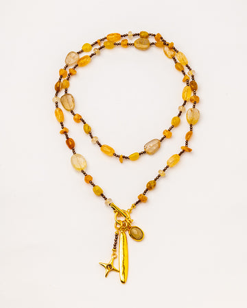Long necklace with calcite, citrine, rutilated quartz, hematite, labradorite, opal
