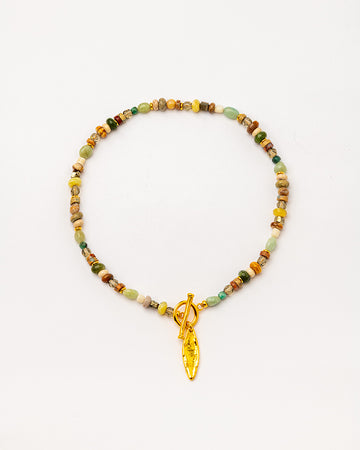 Short necklace with fossil coral, smoky quartz, cherry quartz, garnet, red hematite, muscovite, opalite, river stone, moonstone and tourmaline