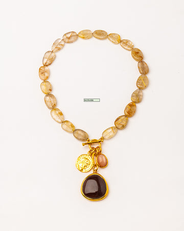Short necklace with rutilated quartz, lepidolite and moonstone